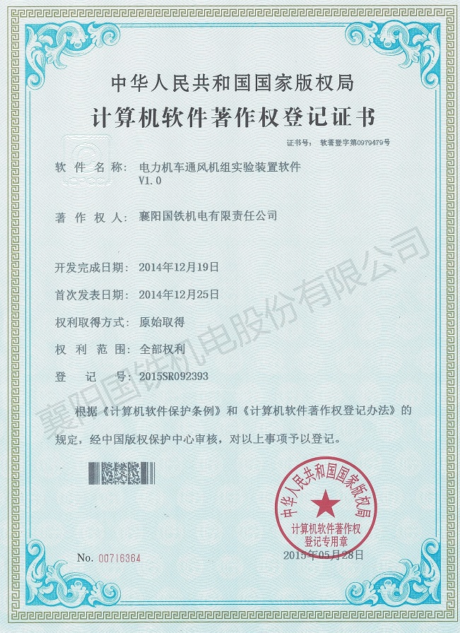 電力機車通風機組實驗裝置軟件(軟件著作權證書)